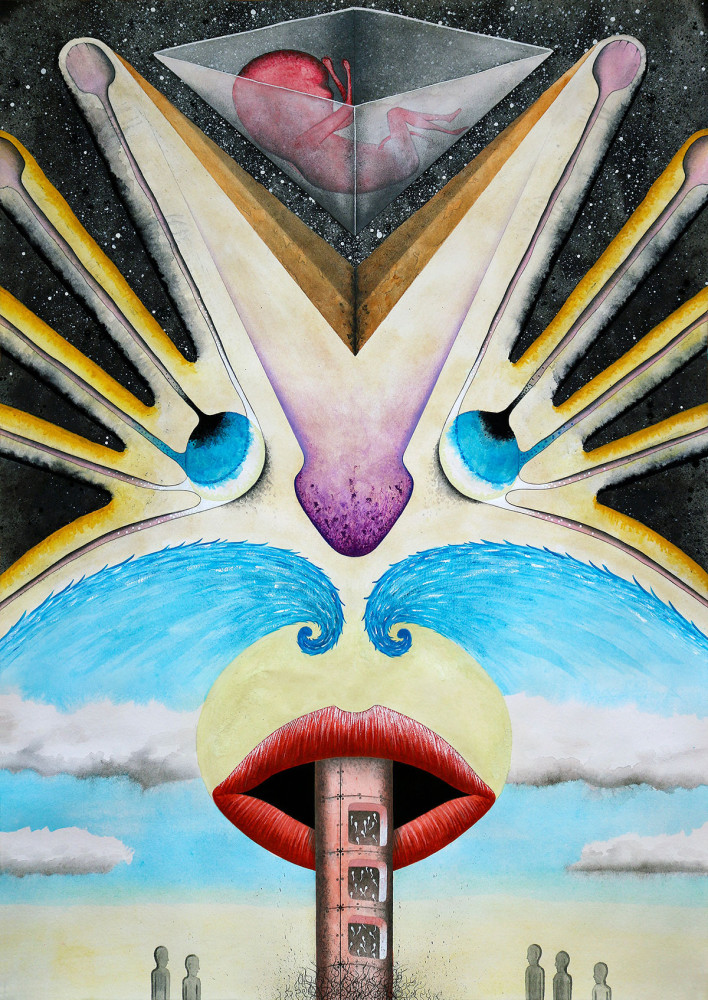 Colour – Most of my pieces are created in colour on A-sized paper, primarily A2. They are mixed media works that layer watercolour, gouache, acrylic, pencil, Posca pens, and water-soluble graphite. The process is intuitive and open-ended, producing vivid, chaotic, and intricate surfaces where meaning is left deliberately undefined — interpretation belongs to you.