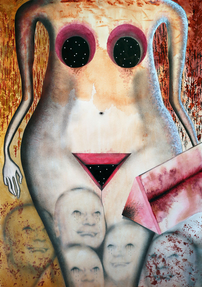 Black & White – Stripped back to essentials, my black and white work is mostly gouache, often combined with Posca pens and dark pencil. I flood the paper with water and allow the pigment to spread and settle, creating stark contrasts and textures that feel raw and unpredictable.